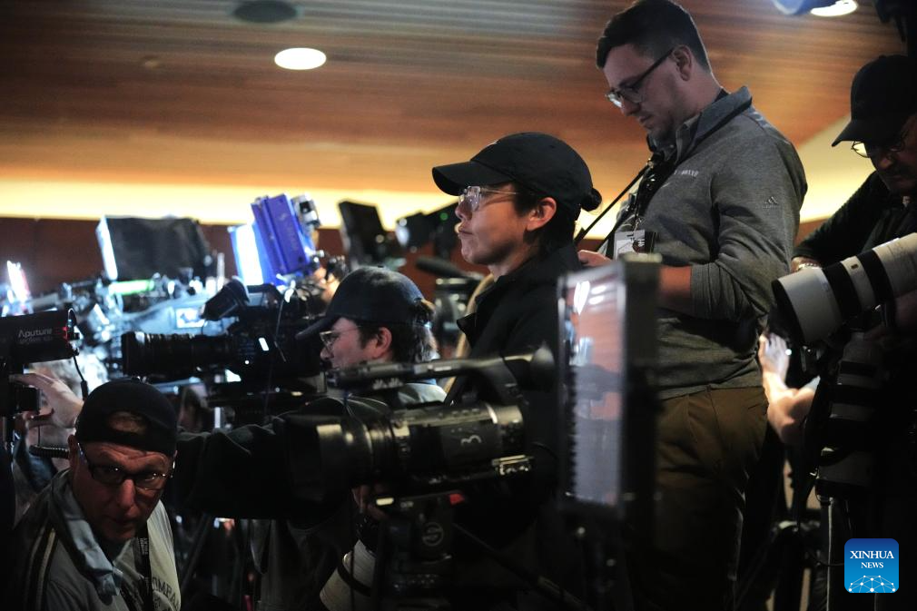 Journalists work in a press room ahead of a meeting between Russian President Vladimir Putin and U.S. President Donald Trump at Joint Base Elmendorf-Richardson in Anchorage, Alaska, the United States, on Aug. 15, 2025. (Xinhua/Wu Xiaoling)