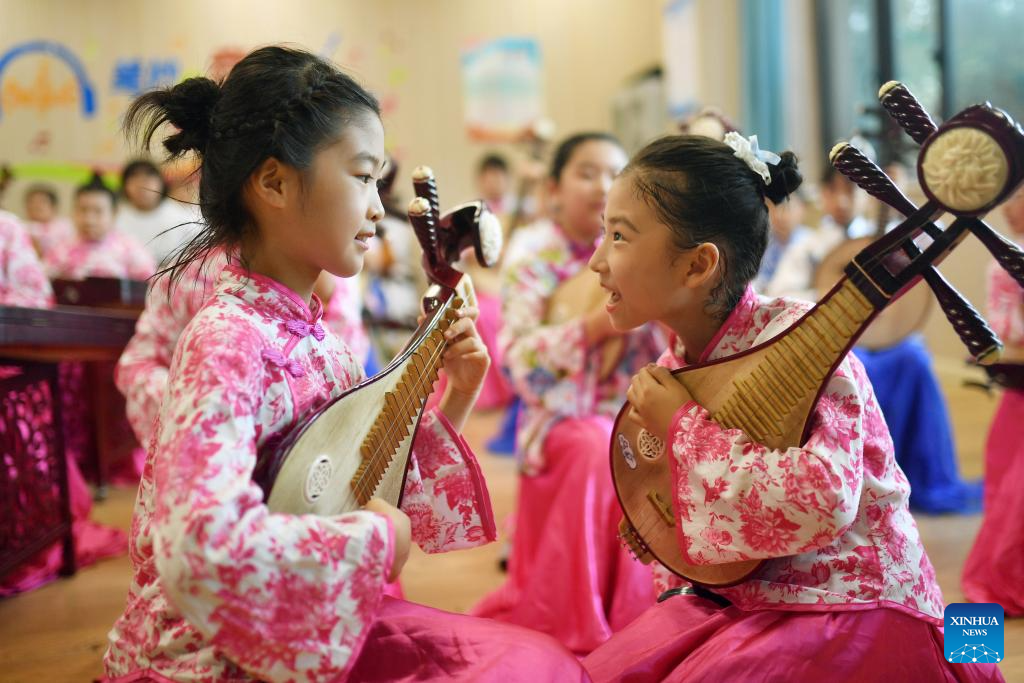 Children attend a music-themed gathering in Chengyang District of Qingdao City, east China's Shandong Province, Aug. 16, 2025. (Photo by Wang Haibin/Xinhua)