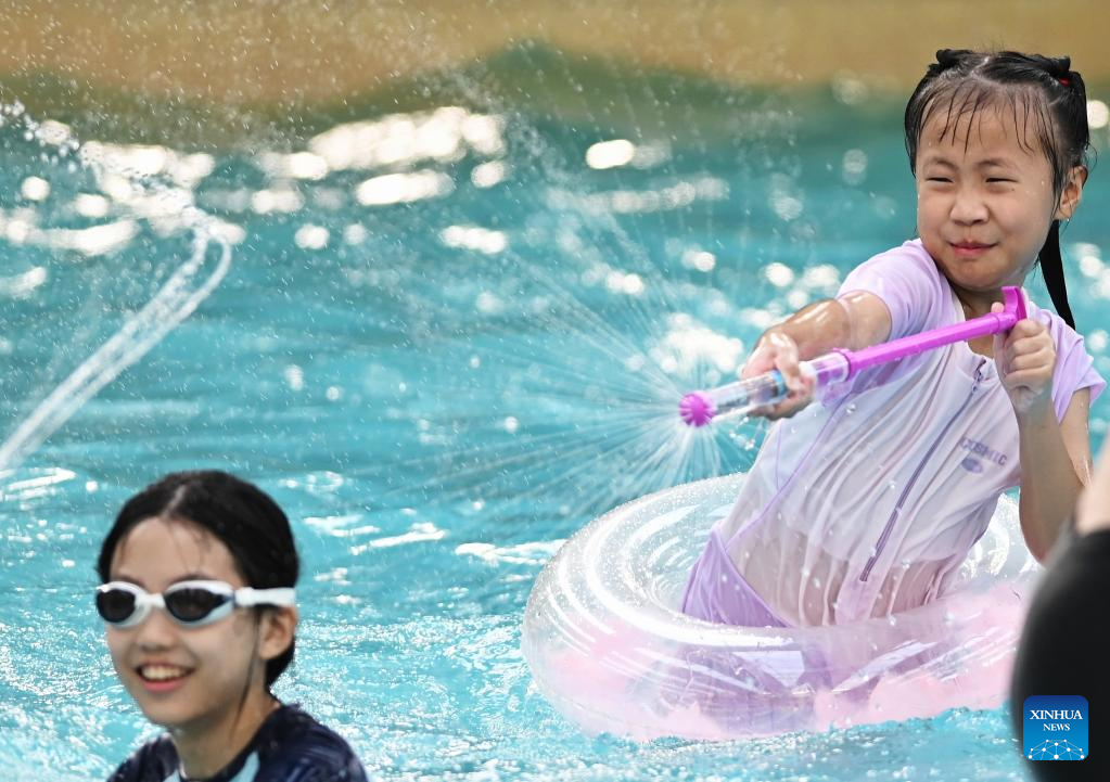 Children play at a water amusement park in Tengzhou City, east China's Shandong Province, Aug. 16, 2025. (Photo by Li Zhijun/Xinhua)