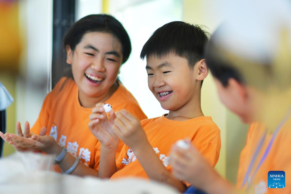 Children learn to make dough sculptures in Chengyang District of Qingdao City, east China's Shandong Province, Aug. 15, 2025. (Photo by Wang Haibin/Xinhua)