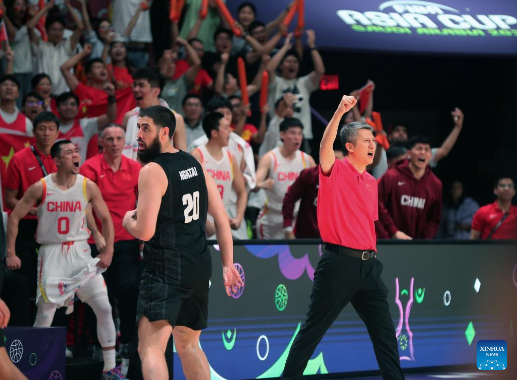 Guo Shiqiang (R), head coach of China, celebrates scoring during the semifinal match between China and New Zealand at the FIBA Asia Cup 2025 in Jeddah, Saudi Arabia, Aug. 16, 2025. (Xinhua/Wang Dongzhen)