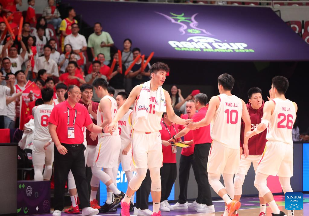 Players of China celebrate scoring during the semifinal match between China and New Zealand at the FIBA Asia Cup 2025 in Jeddah, Saudi Arabia, Aug. 16, 2025. (Xinhua/Wang Dongzhen)