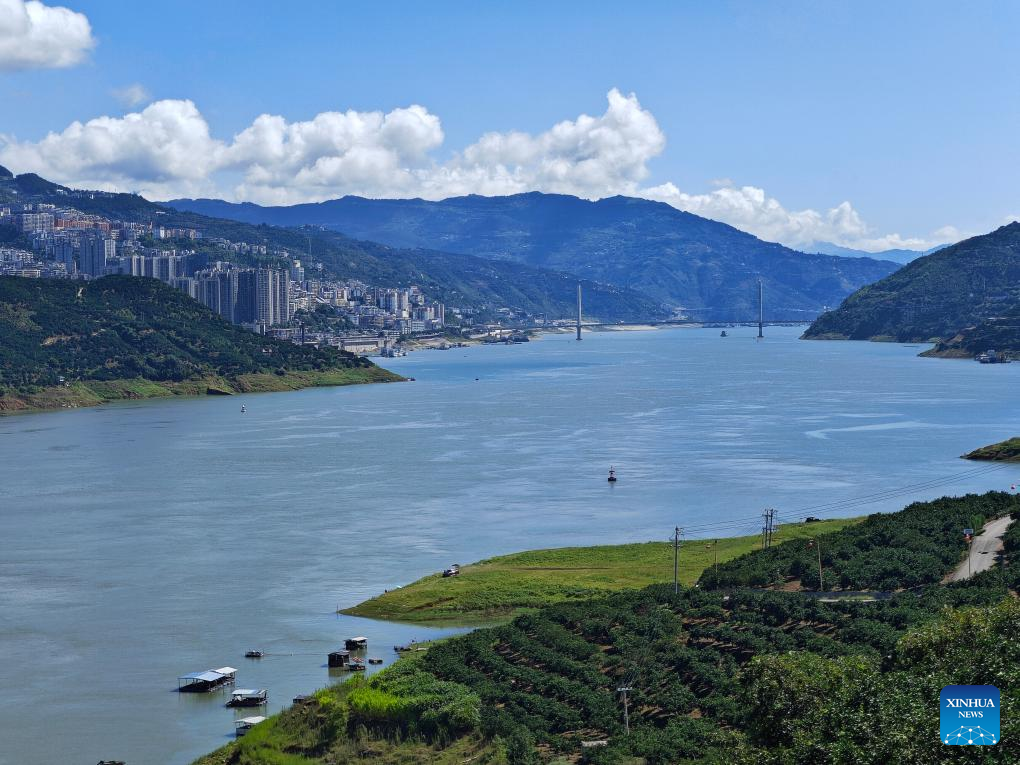 This photo taken on Aug. 13, 2025 shows a navel orange orchard on the bank of the Yangtze River in Daba Village of Fengjie County, southwest China's Chongqing Municipality. (Xinhua/Jiang Shengxiong)