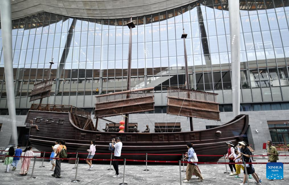 People visit the Grand Canal Museum of Beijing in Tongzhou District of Beijing, capital of China, Aug. 15, 2025. Connecting Beijing and Hangzhou in east China's Zhejiang Province, the Grand Canal is the world's longest artificial waterway.