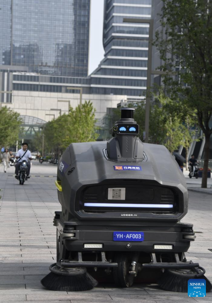 A robotic cleaner works at a business district along the Grand Canal in Tongzhou District of Beijing, capital of China, Aug. 16, 2025. Connecting Beijing and Hangzhou in east China's Zhejiang Province, the Grand Canal is the world's longest artificial waterway.