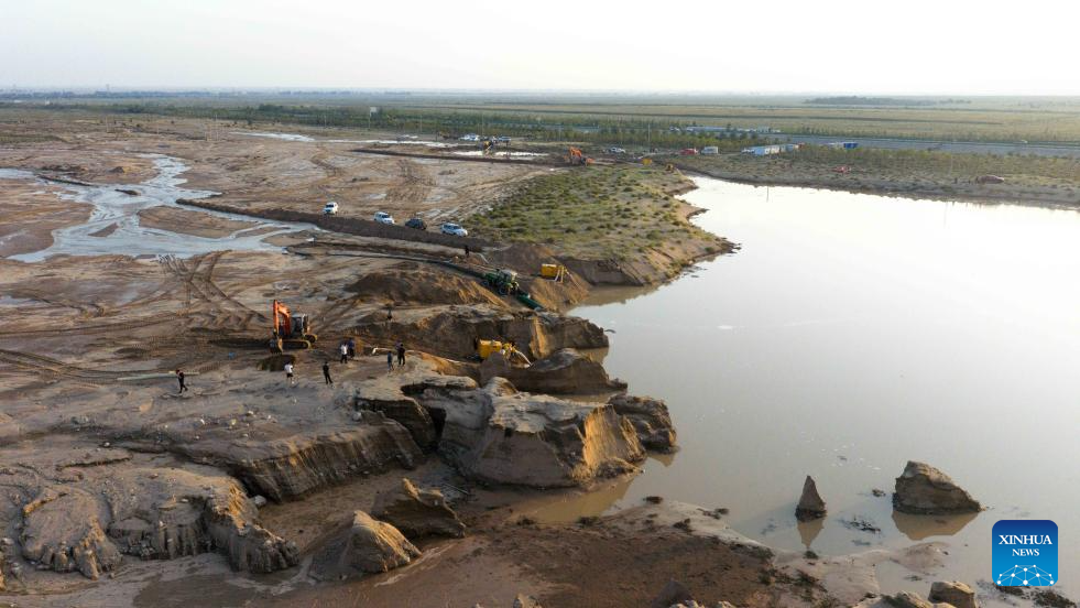 An aerial drone photo taken on Aug. 17, 2025 shows rescuers searching for missing individuals in Urad Rear Banner of Bayannur City, north China's Inner Mongolia Autonomous Region.