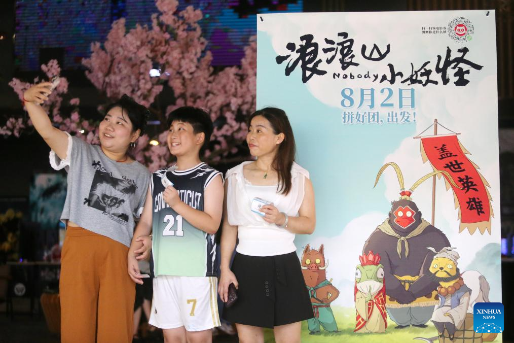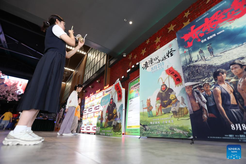 Audiences stand in front of film posters at a cinema in Wuxi, east China's Jiangsu Province, Aug. 17, 2025. The film market has witnessed a big upsurge this weekend as various hot films go screening during the summer vacation. (Photo by Huan Yueliang/Xinhua)