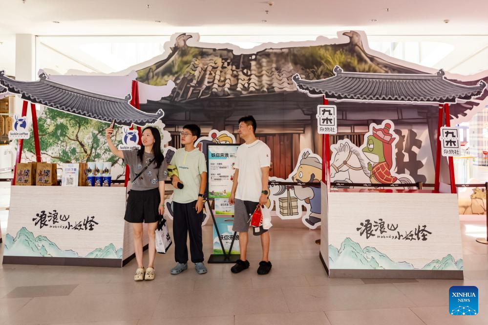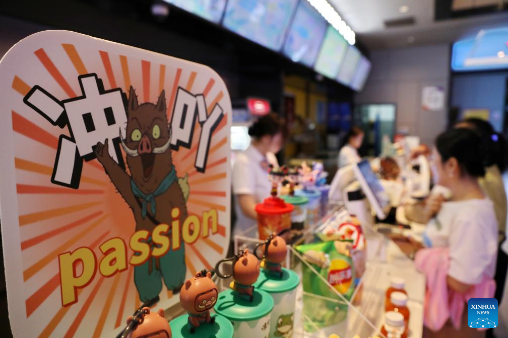 Cultural and creative products are displayed at a cinema in Jiaxing, east China's Zhejiang Province, Aug. 17, 2025. The film market has witnessed a big upsurge this weekend as various hot films go screening during the summer vacation. (Photo by Jin Peng/Xinhua)