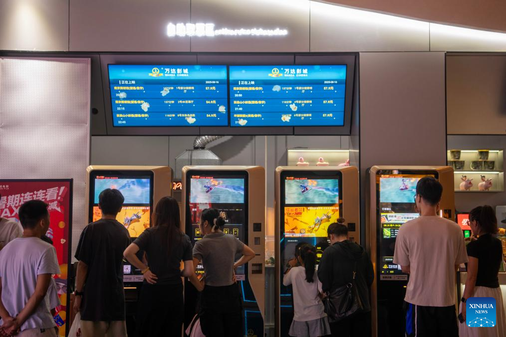 Citizens buy tickets from machines at a cinema in Yuyao, east China's Zhejiang Province, Aug. 16, 2025. The film market has witnessed a big upsurge this weekend as various hot films go screening during the summer vacation. (Photo by Zhang Hui/Xinhua)