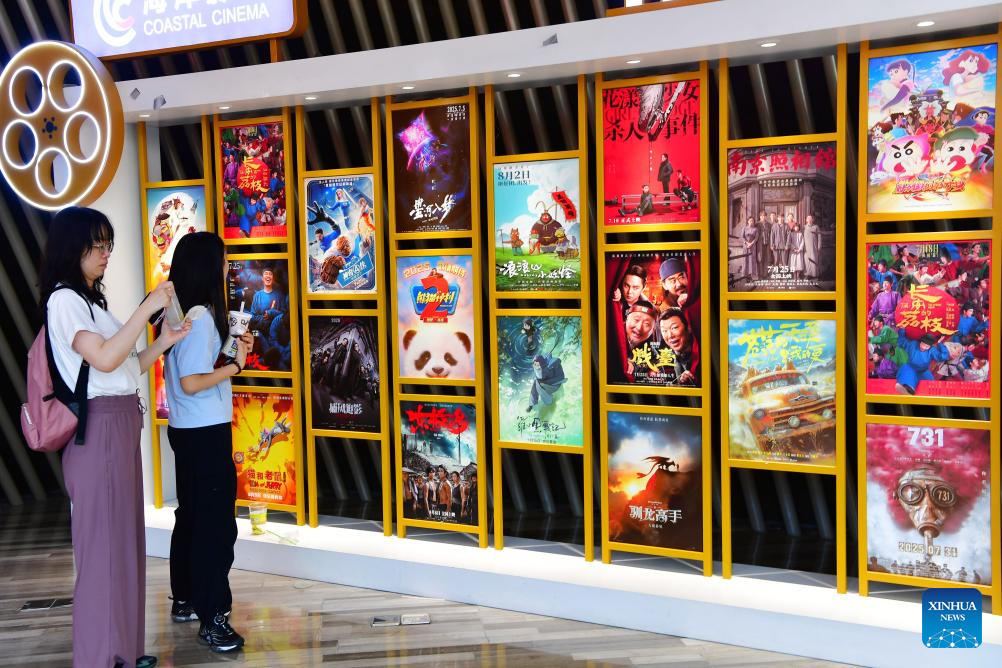Audiences walk past film posters at a cinema in Nanjing, east China's Jiangsu Province, Aug. 17, 2025. The film market has witnessed a big upsurge this weekend as various hot films go screening during the summer vacation. (Photo by Su Yang/Xinhua)