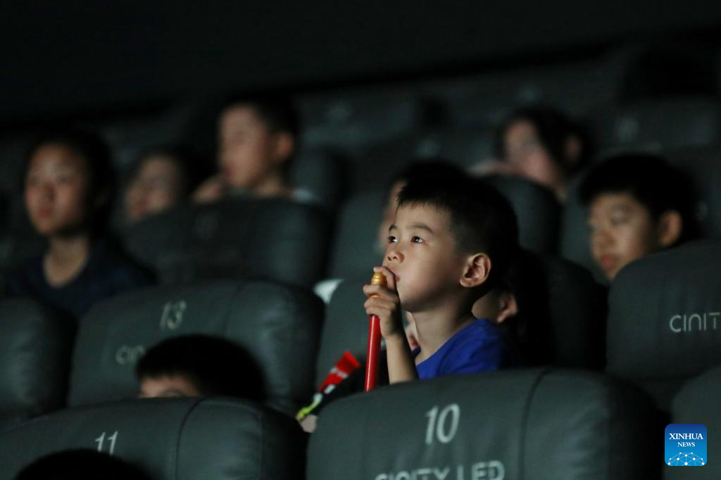 Children wait to watch a film at a cinema in Jiaxing, east China's Zhejiang Province, Aug. 17, 2025. The film market has witnessed a big upsurge this weekend as various hot films go screening during the summer vacation. (Photo by Jin Peng/Xinhua)