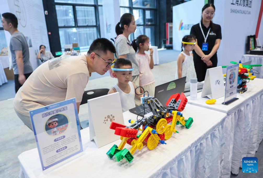 Children compete in a game at the Wuzhen Youth Tech Carnival in Wuzhen, east China's Zhejiang Province, on Aug. 17, 2025. The first Wuzhen Youth Tech Carnival is held from Aug. 15 to 25 in Wuzhen of Tongxiang City. This 11-day technology event, bringing together more than 40,000 young technology enthusiasts from all over the world, builds up a comprehensive platform for teenagers to show wisdom, boost innovation and touch the future. (Xinhua/Xu Yu)