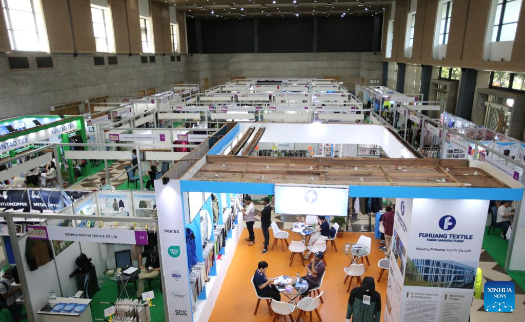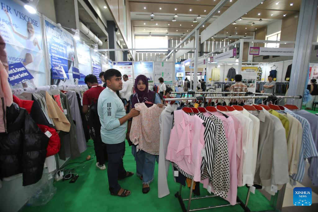 The event, with the participation of more than 100 overseas companies along with local exhibitors, is held in Dhaka from Aug. 14 to 18. It showcases the latest collections of yarn, fabrics, and garment accessories for the country's ready-made garment (RMG) sector. (Photo by Habibur Rahman/Xinhua)