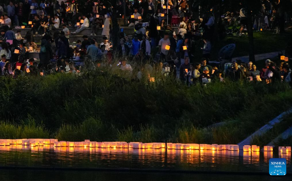 People participate in the Water Lantern Festival at Lafarge Lake in Coquitlam, British Columbia, Canada, Aug. 16, 2025. The event attracted hundreds of residents and visitors to enjoy the illuminated lanterns and share wishes for hope and joy. (Photo by Liang Sen/Xinhua)