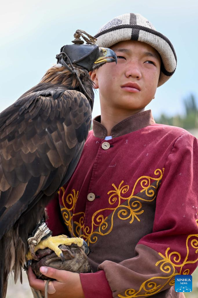 Zhapar, son of hunter Nursultan, is pictured holding a raptor near Cholpon-Ata, Kyrgyzstan, on Aug. 16, 2025.