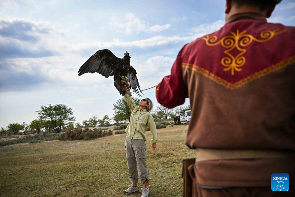 A foreign visitor experiences raptor training near Cholpon-Ata, Kyrgyzstan, on Aug. 16, 2025.
