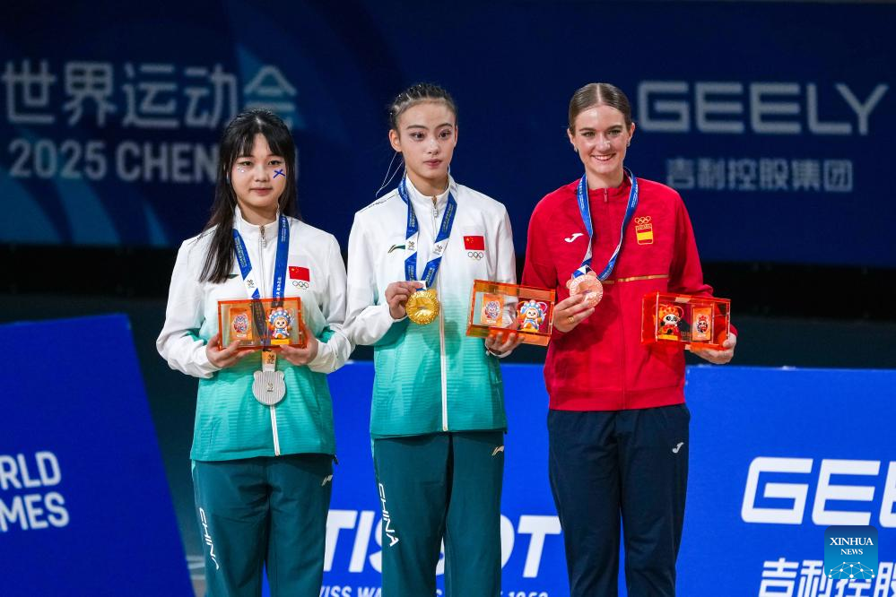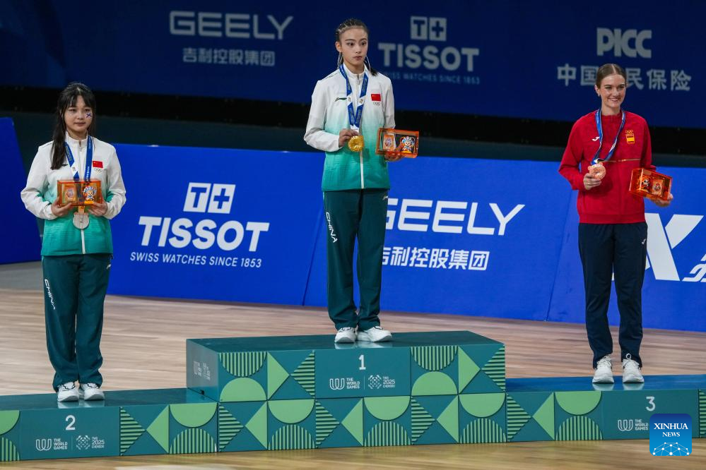 Gold medalist Zhu Siyi (C) of China, silver medalist Liu Jiaxin (L) of China and bronze medalist Laura Oria Albelda of Spain attend the victory ceremony for the Women's Classic Slalom of Inline Freestyle Skating event at The World Games 2025 in Chengdu, southwest China's Sichuan Province, Aug. 17, 2025. (Xinhua/Li Bo)
