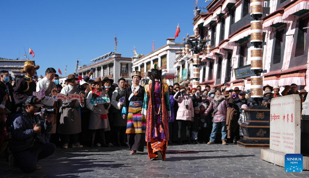 Models in Tibetan attire take part in a parade in Lhasa, southwest China's Xizang Autonomous Region, Jan. 3, 2025.