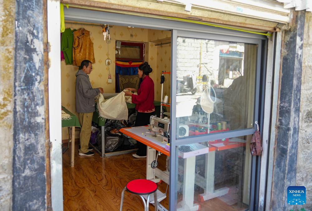 Losang Monlam (L) and his apprentice check the quality of Tibetan attire in Lhasa, southwest China's Xizang Autonomous Region, Aug. 15, 2025.