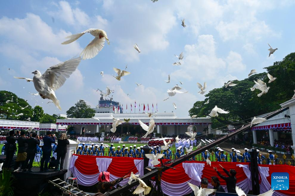 Pigeons fly during the celebration event of Indonesia's 80th Independence Day at Merdeka Palace in Jakarta, Indonesia on Aug. 17, 2025. Various activities were held to celebrate the 80th Independence Day in Indonesia. (Xinhua/Zulkarnain)