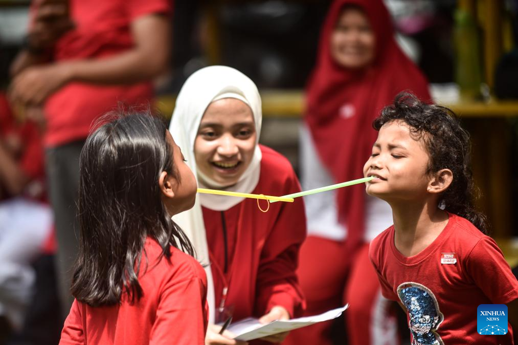 Children participate in fun games during celebration of the 80th Independence Day of Indonesia in Ciputat, South Tangerang, Indonesia, on Aug. 17, 2025. Various activities were held to celebrate the 80th Independence Day in Indonesia. (Xinhua/Agung Kuncahya B.)