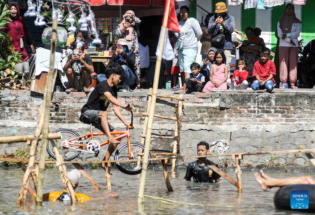 People watch the fun games of tiny bike bridge challenge during celebration of the 80th Independence Day of Indonesia in Surabaya, East Java, Indonesia, on Aug. 17, 2025. Various activities were held to celebrate the 80th Independence Day in Indonesia. (Photo by Sahlan Kurniawan/Xinhua)