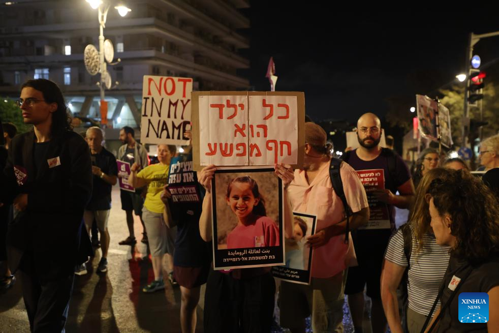 People gathered in the evening to protest against the Israeli military's "starvation policy" in Gaza and urged the Israeli government to swiftly end the Gaza war. (Photo by Jamal Awad/Xinhua)
