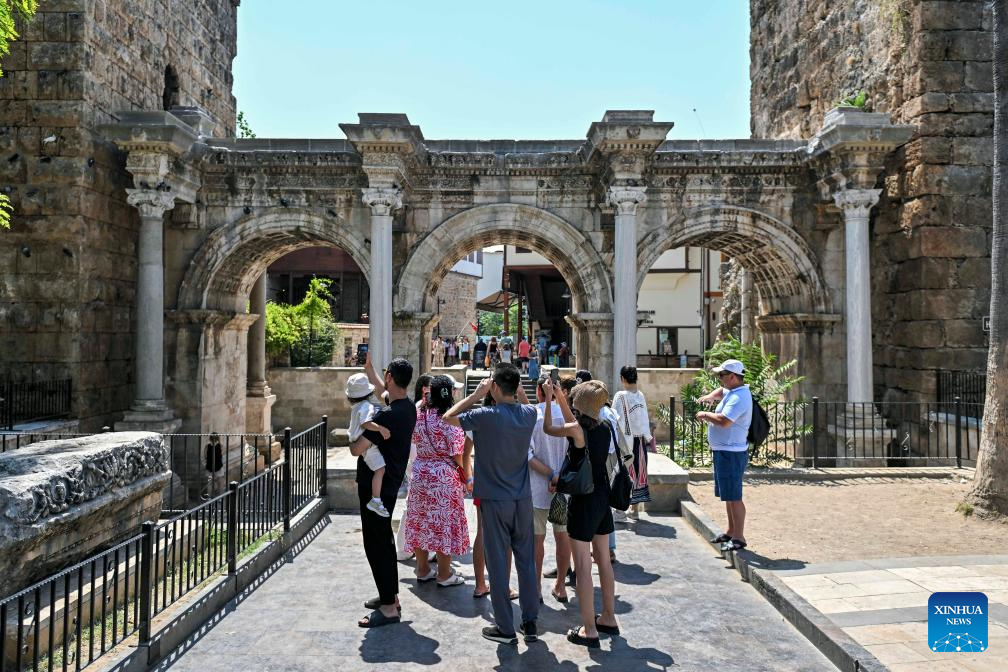 Tourists visit Hadrian's Gate in Antalya, Türkiye, on Aug. 18, 2025. (Mustafa Kaya/Handout via Xinhua)
