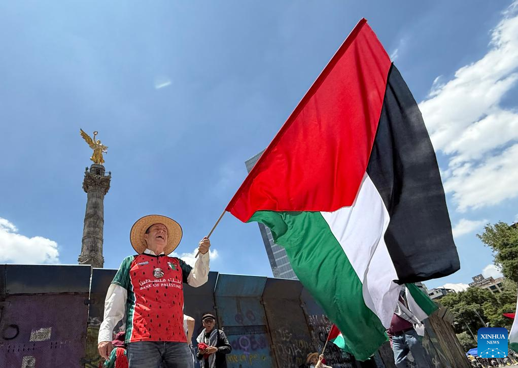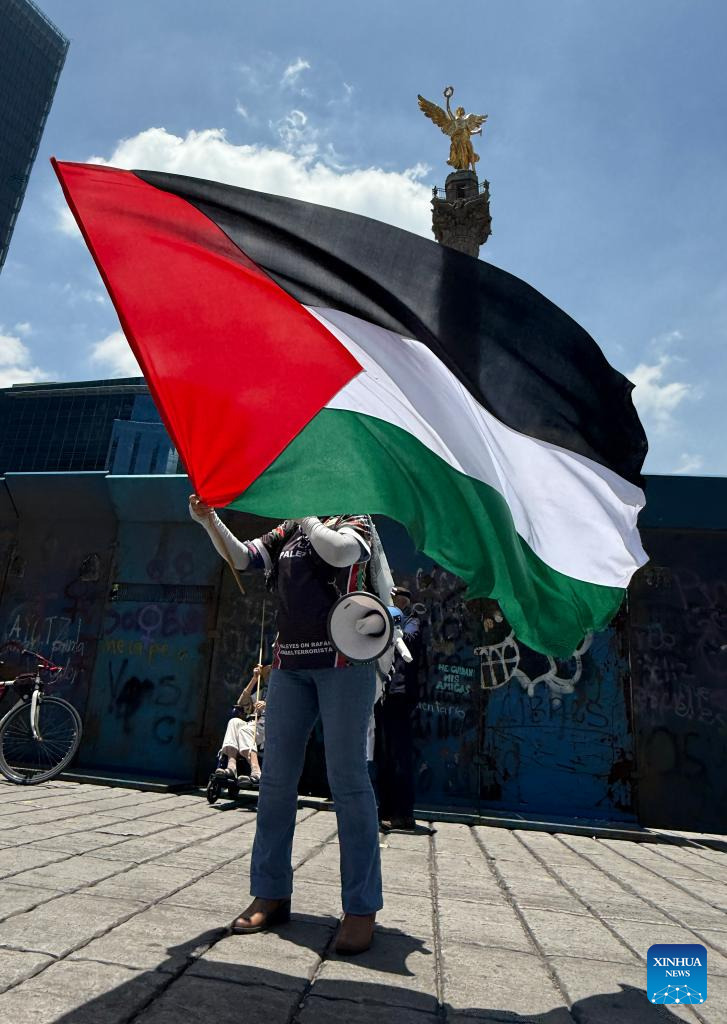This photo taken with a mobile phone shows a protester waving the Palestinian flag to protest the ongoing war and famine in Gaza at the monument, the Angel of Independence, in Mexico City, Mexico, on Aug. 17, 2025. (Xinhua/Wu Wei)