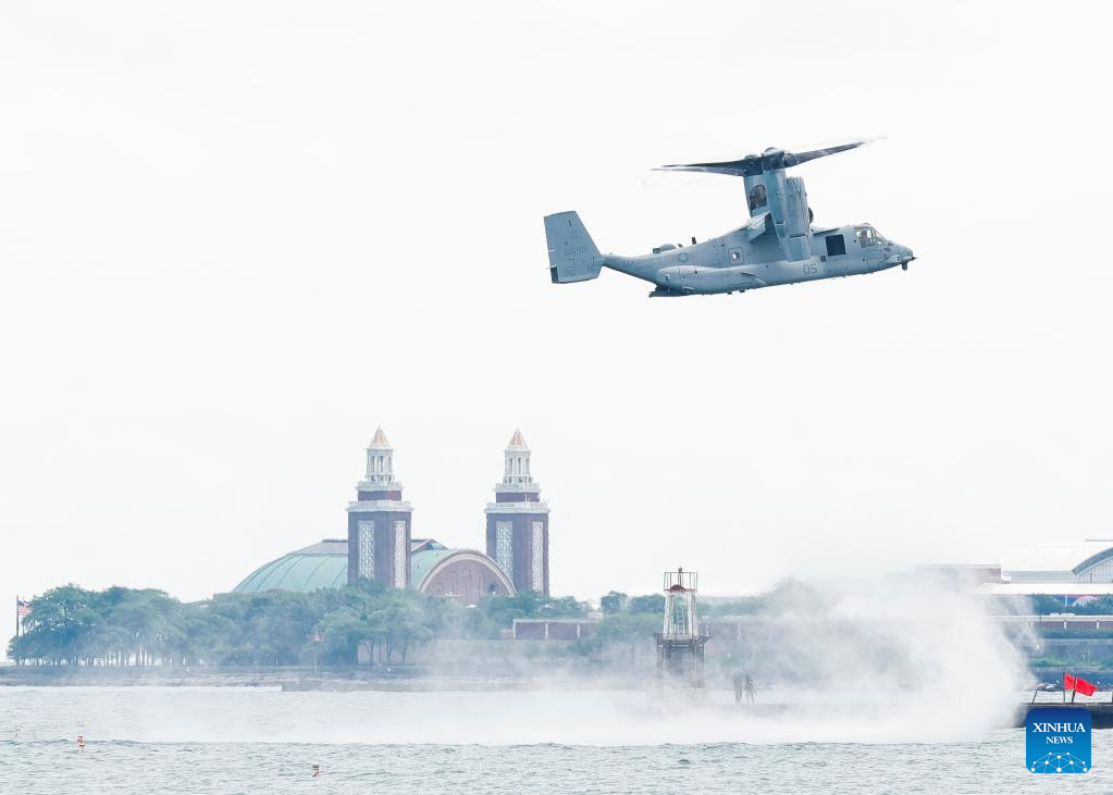 A U.S. Marine Corps MV-22 Osprey aircraft performs during the 2025 Chicago Air and Water Show in Chicago, the United States, Aug. 17, 2025. (Photo by Joel Lerner/Xinhua)