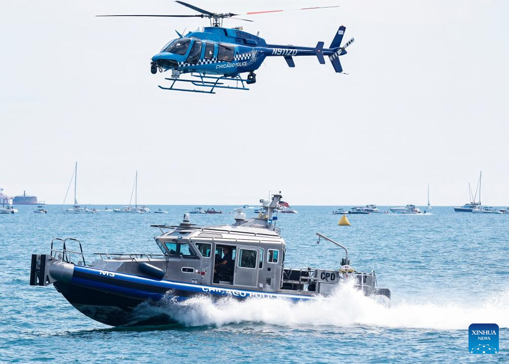 A helicopter and water rescue team of Chicago Police Department stages a demonstration during the 2025 Chicago Air and Water Show in Chicago, the United States, Aug. 17, 2025. (Photo by Joel Lerner/Xinhua)