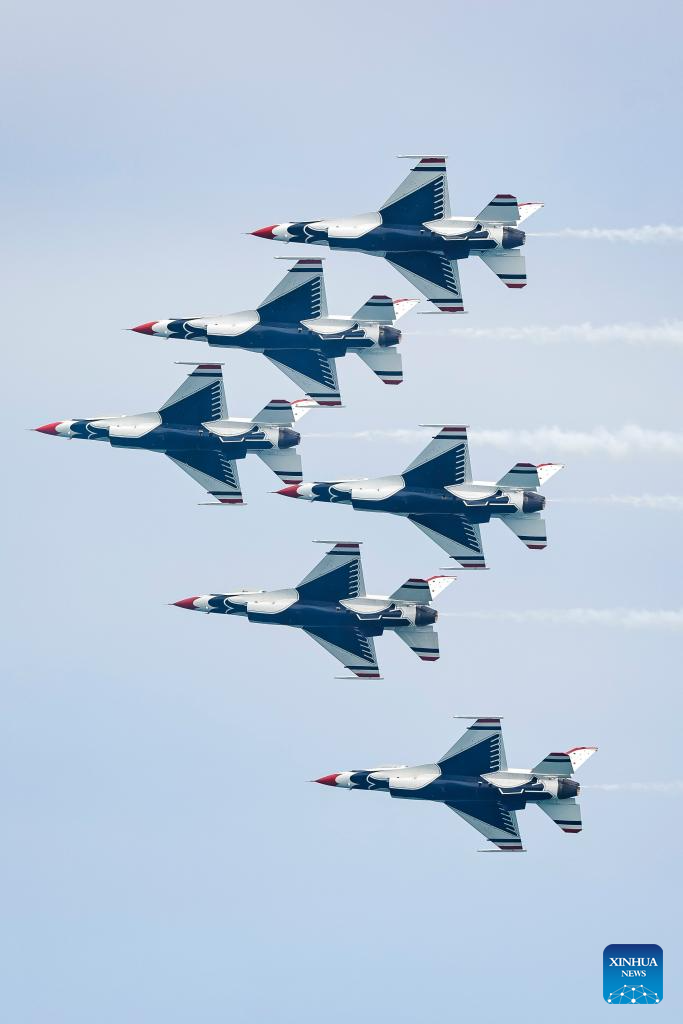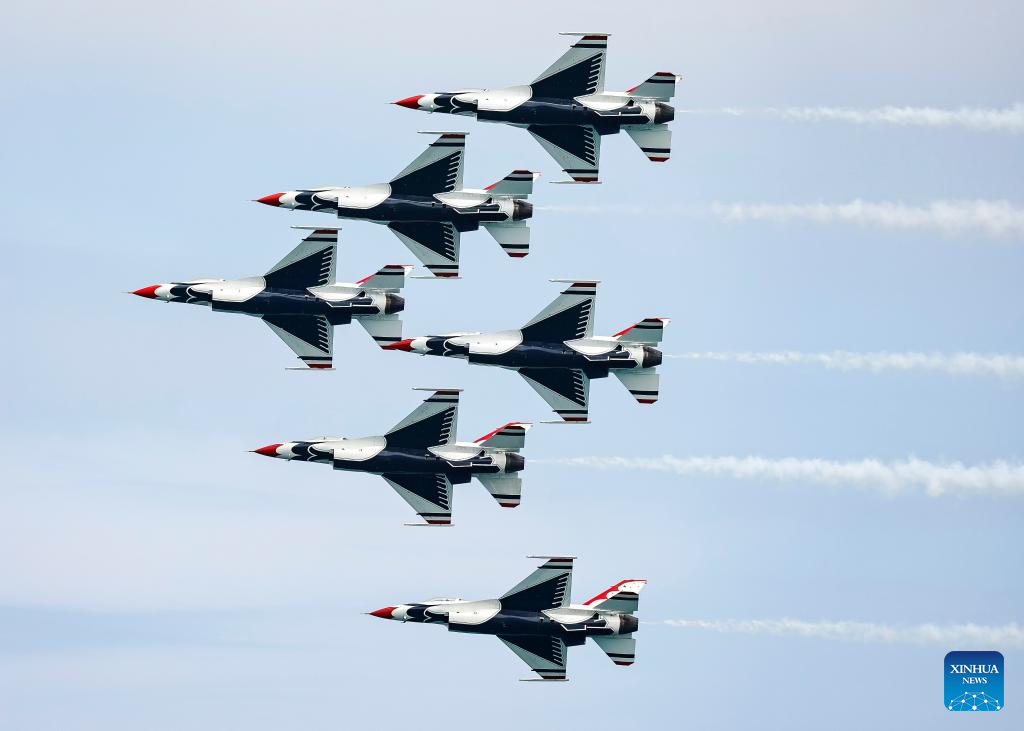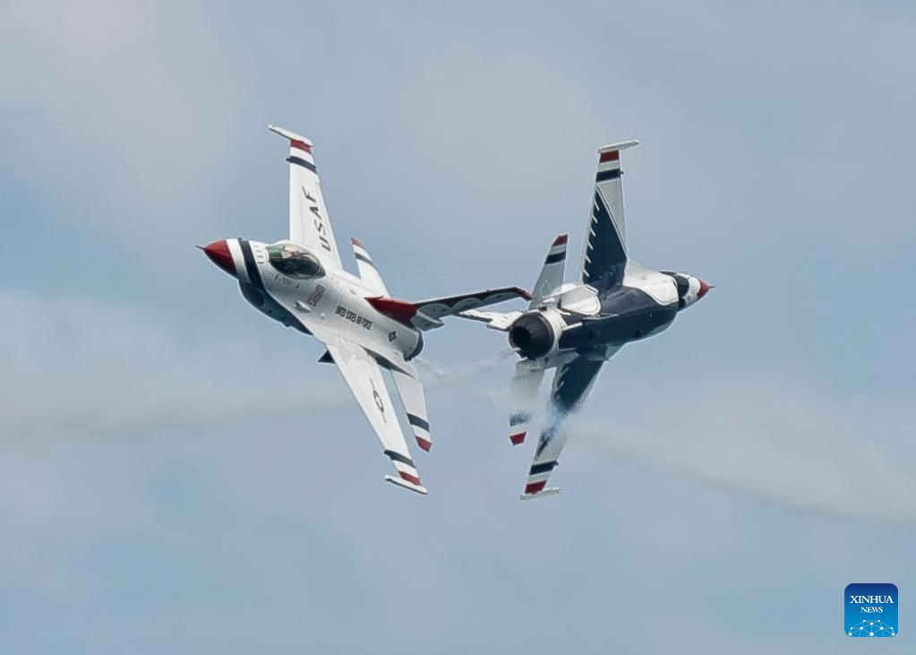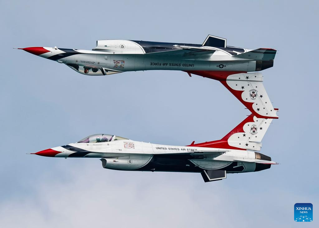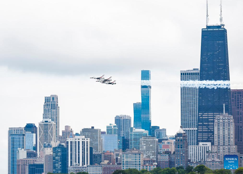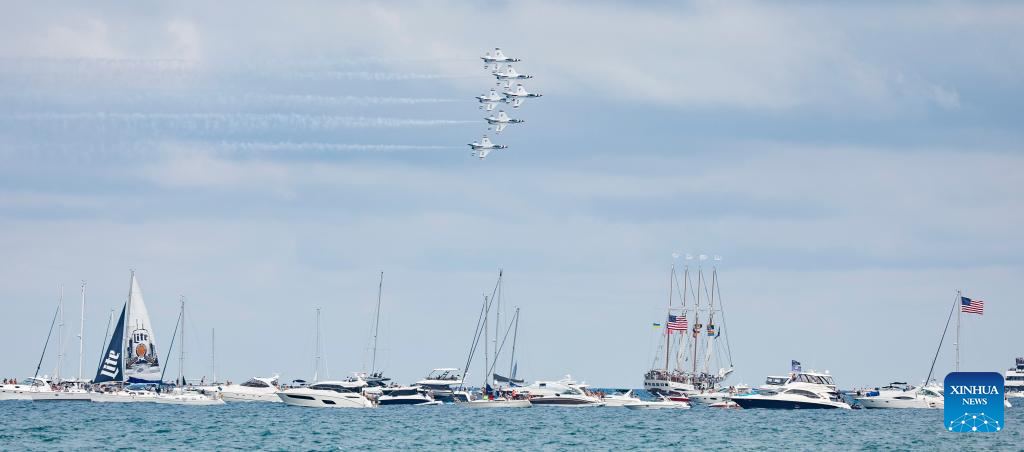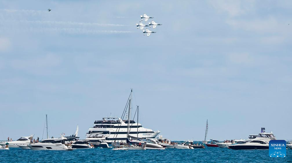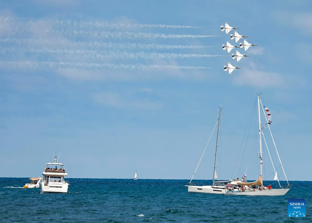 The U.S. Air Force Air Demonstration Squadron, known as the "Thunderbirds," performs during the 2025 Chicago Air and Water Show in Chicago, the United States, Aug. 17, 2025. (Photo by Joel Lerner/Xinhua)