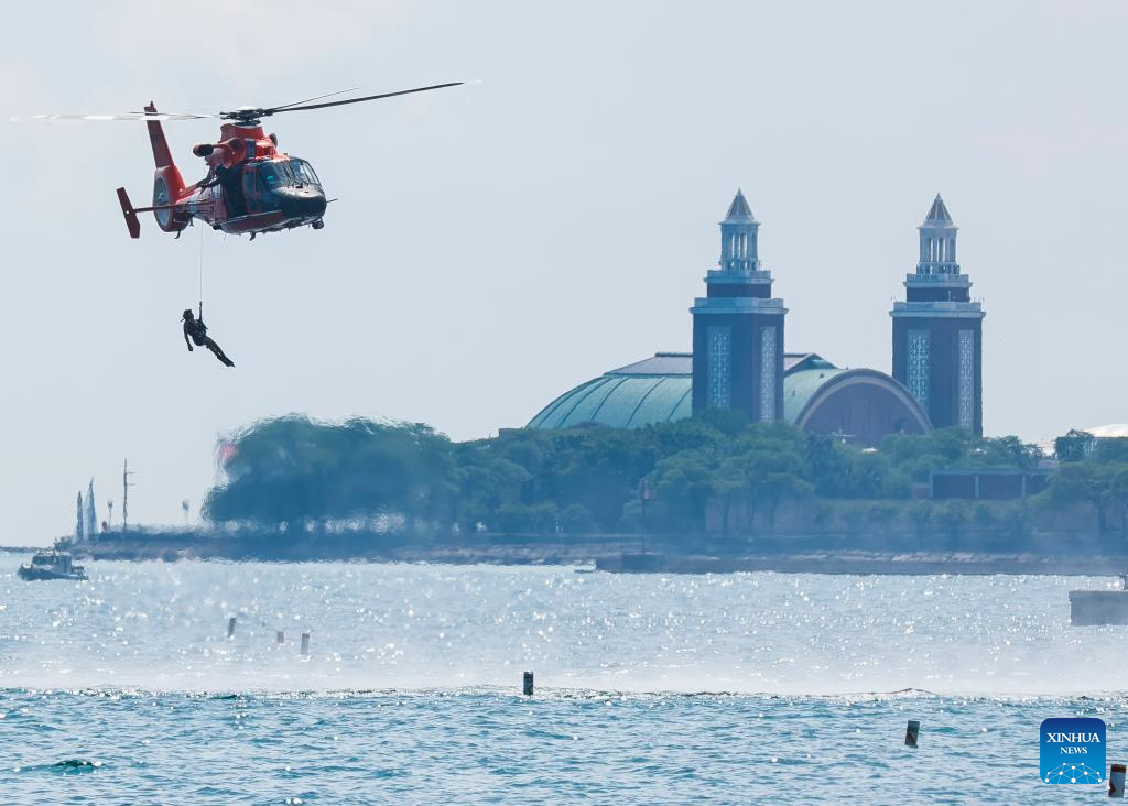 Members of U.S. Coast Guard Search and Rescue stages a demonstration during the 2025 Chicago Air and Water Show in Chicago, the United States, Aug. 17, 2025. (Photo by Joel Lerner/Xinhua)