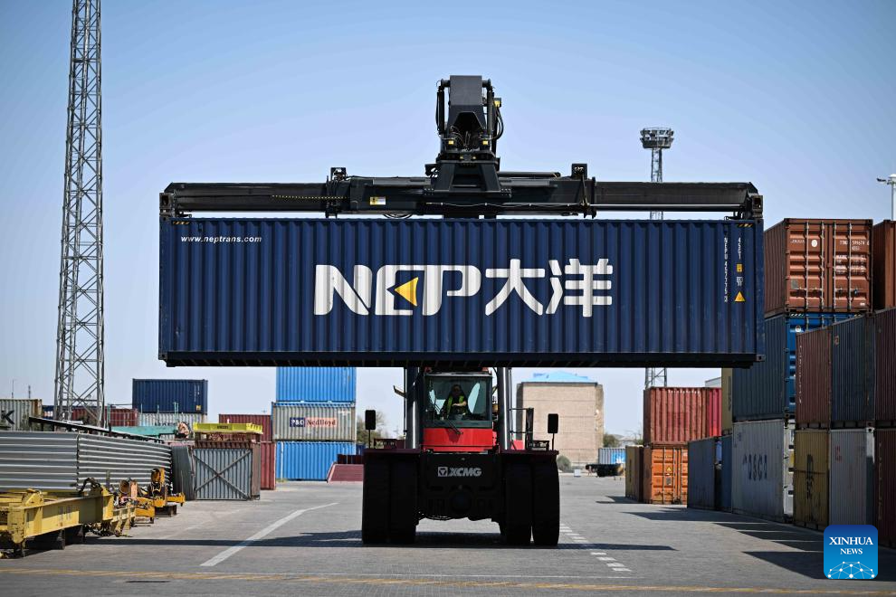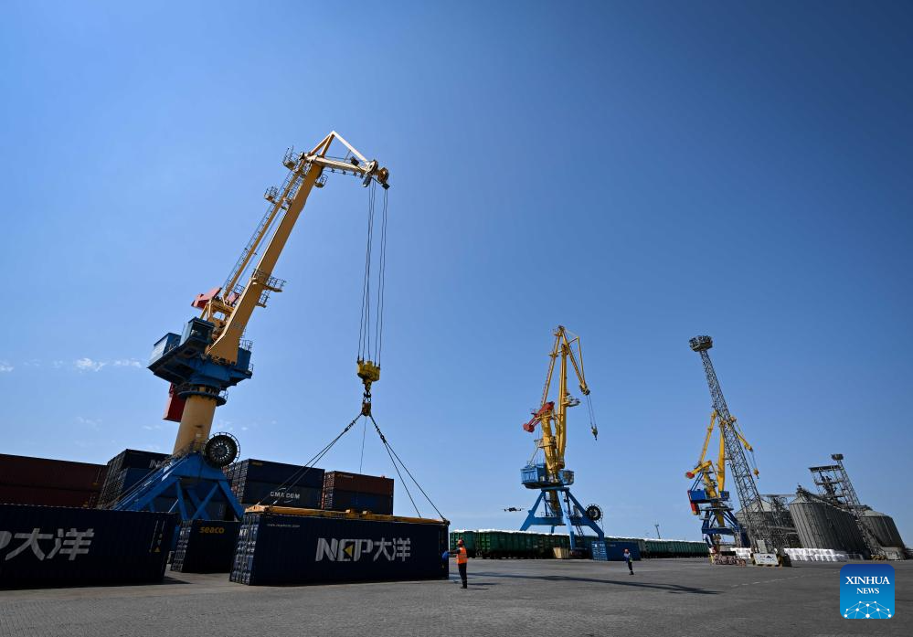 A crane lifts containers at Aktau port in Kazakhstan, on Aug. 6, 2025.