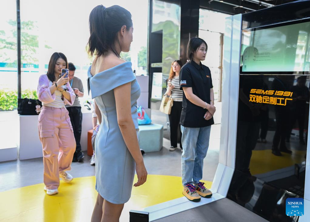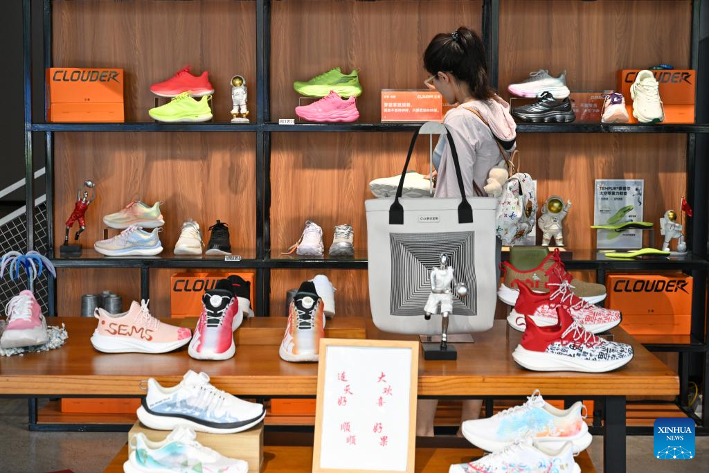 A customer selects customized shoes at the store of a footwear company in Putian, southeast China's Fujian Province, Aug. 19, 2025. At a custom-made factory in Putian, an equipment is recording a consumer' foot measurements to create personalized designs based on the consumer's preferences. The intelligent production line can then manufacture a pair of new shoes in just over an hour.