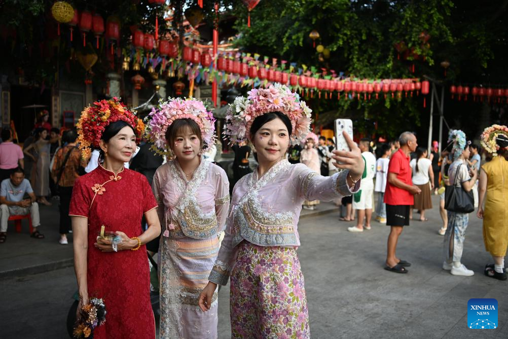 Tourists wearing flowery headwears pose for selfies at Xunpu Village of Quanzhou City, southeast China's Fujian Province, Aug. 18, 2025. Xunpu flowery headwear has been a signature of Xunpu Village and was listed as a national intangible cultural heritage in 2008.