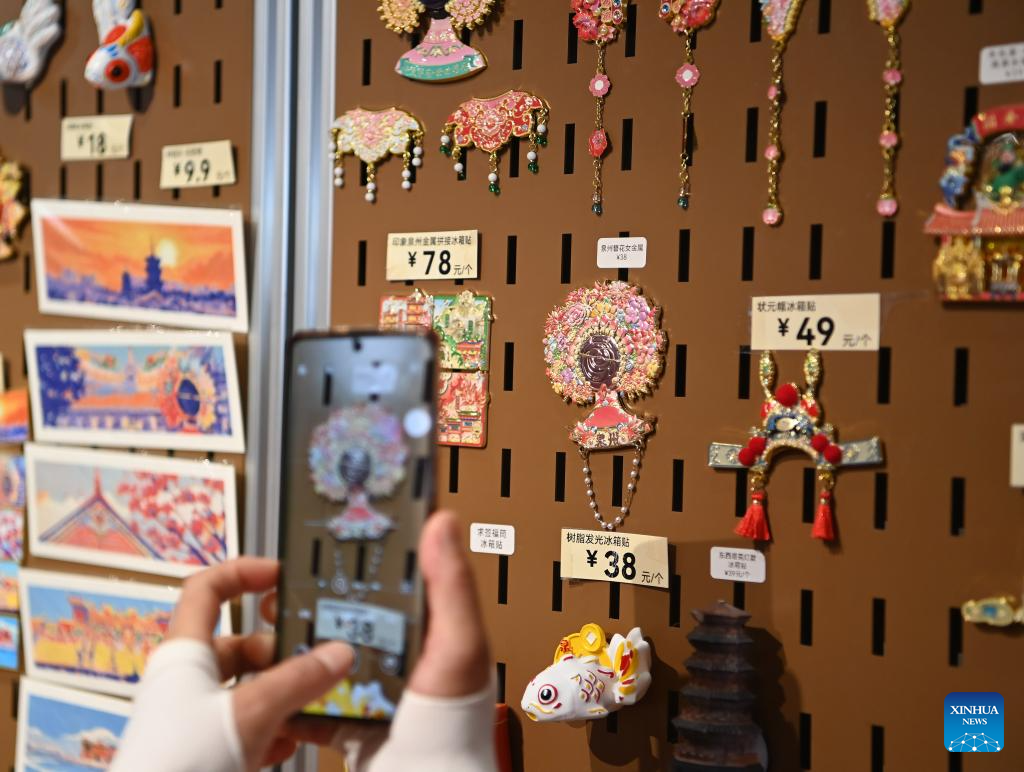A tourist takes photos of a flowery headwear-shaped fridge magnet at Xunpu Village of Quanzhou City, southeast China's Fujian Province, Aug. 18, 2025. Xunpu flowery headwear has been a signature of Xunpu Village and was listed as a national intangible cultural heritage in 2008.