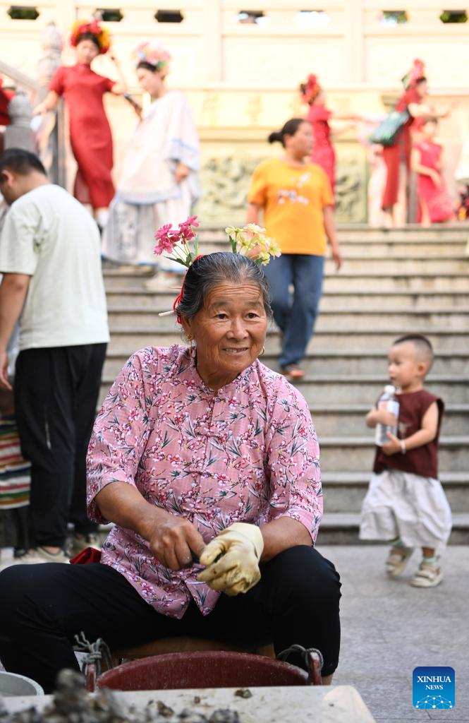 A local woman opens oyster shells at Xunpu Village of Quanzhou City, southeast China's Fujian Province, Aug. 18, 2025. Xunpu flowery headwear has been a signature of Xunpu Village and was listed as a national intangible cultural heritage in 2008.