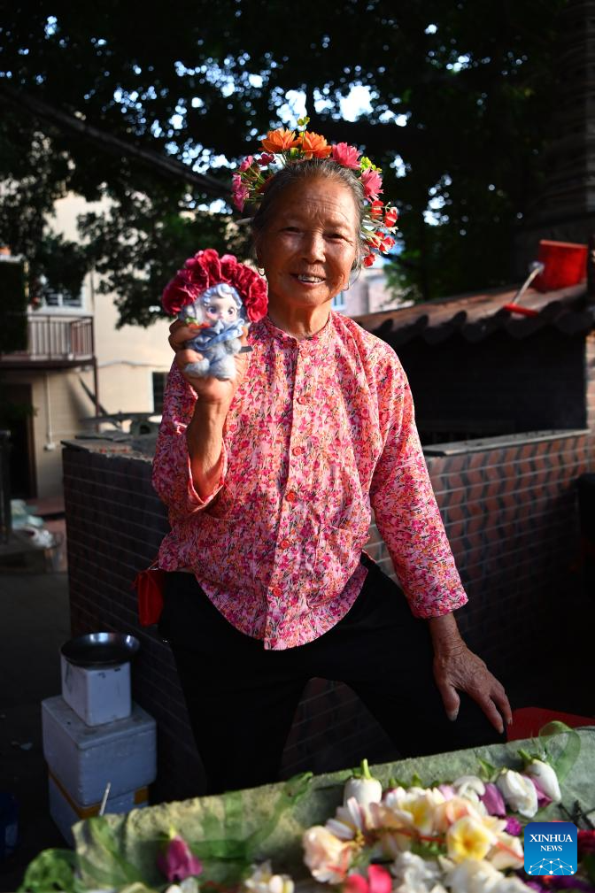A local woman displays a toy wearing a flowery headwear at Xunpu Village of Quanzhou City, southeast China's Fujian Province, Aug. 18, 2025. Xunpu flowery headwear has been a signature of Xunpu Village and was listed as a national intangible cultural heritage in 2008.