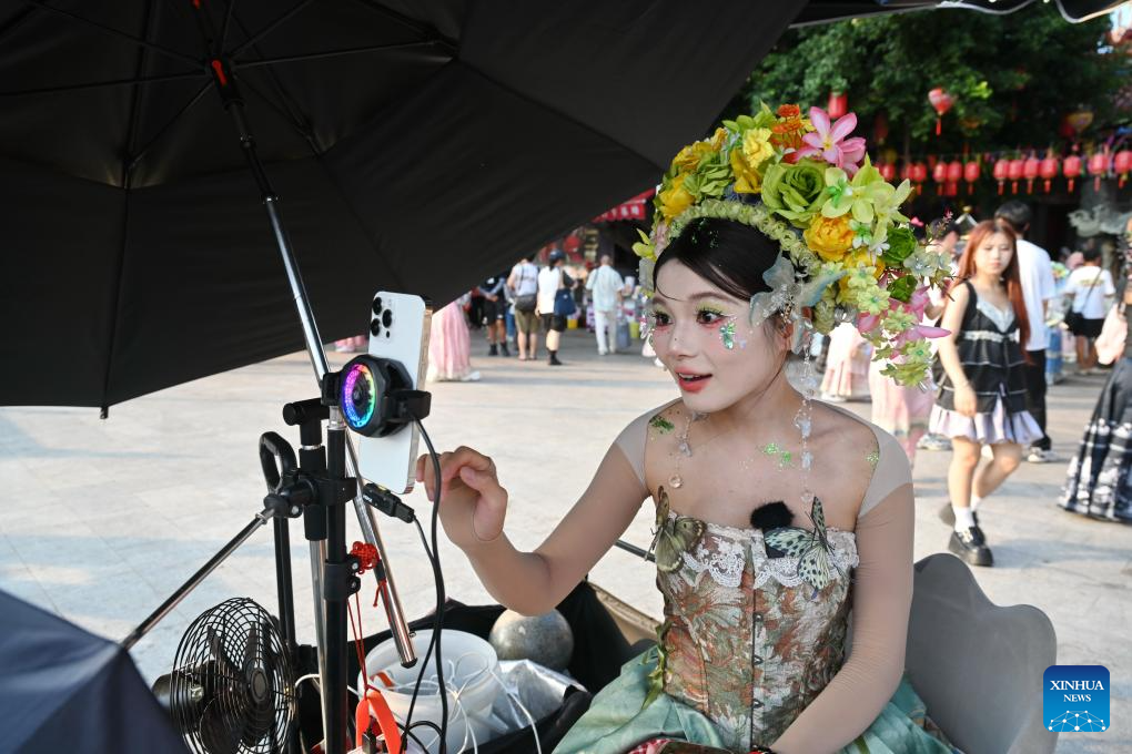 A staff member wearing a flowery headwear introduces local travel photography products via live-streaming at Xunpu Village of Quanzhou City, southeast China's Fujian Province, Aug. 18, 2025. Xunpu flowery headwear has been a signature of Xunpu Village and was listed as a national intangible cultural heritage in 2008.