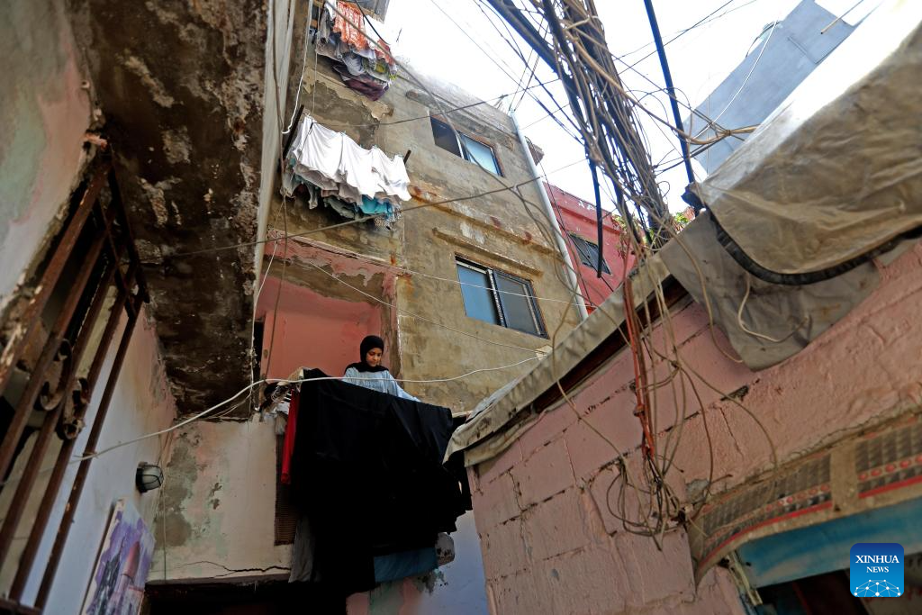 (250819) -- BEIRUT, Aug. 19, 2025 (Xinhua) -- A girl hangs laundry to dry in Burj al-Barajneh Palestinian refugee camp near Beirut, Lebanon, Aug. 14, 2025.