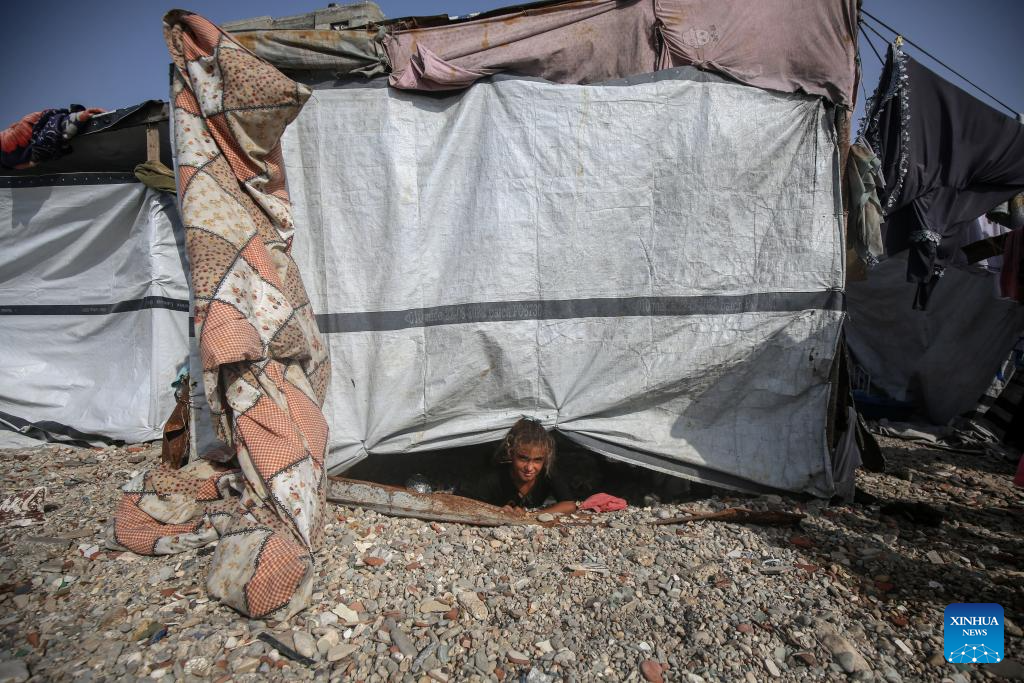(250819) -- GAZA, Aug. 19, 2025 (Xinhua) -- A displaced Palestinian child is seen in the coastal area of Gaza City on Aug. 14, 2025.