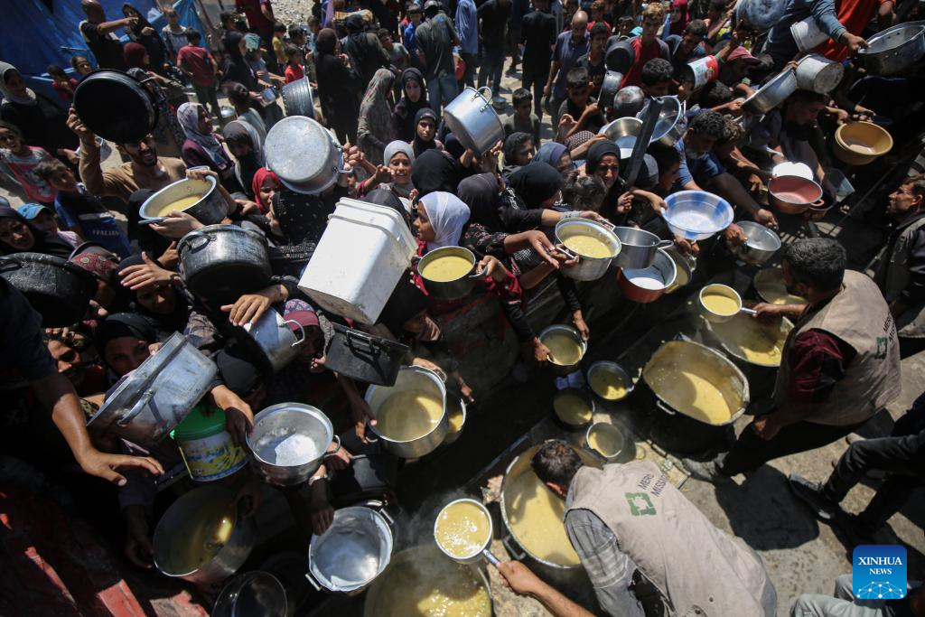 (250819) -- GAZA, Aug. 19, 2025 (Xinhua) -- Displaced Palestinians receive free food in Gaza City on Aug. 10, 2025.