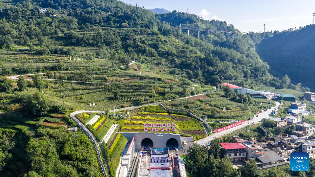An aerial drone photo taken on Aug. 19, 2025 shows the construction site of Binghui tunnel in Yiliang county of Zhaotong, southwest China's Yunnan Province. As a key project of the Chongqing-Kunming high-speed railway, Binghui tunnel, with a total length of 21.17 kilometers, was successfully completed here on Tuesday.