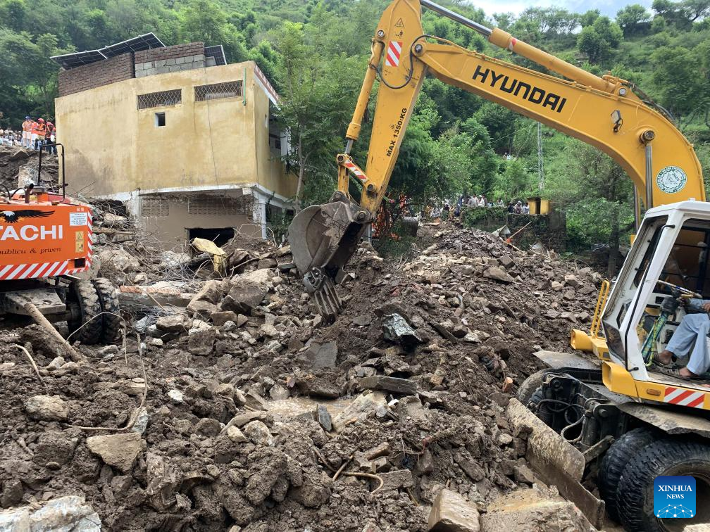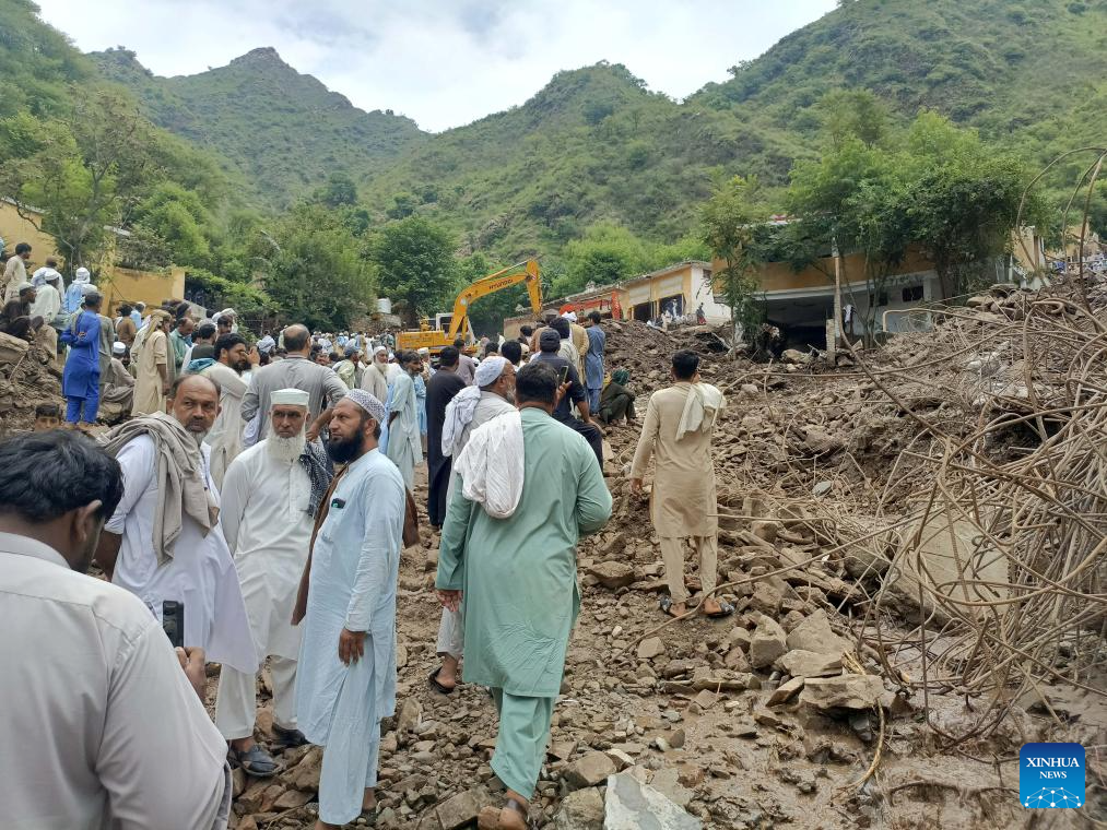 Residents watch as relief personnel search through the rubble of collapsed houses for victims during a rescue operation, a day after a cloudburst in Swabi district of northwest Pakistan's Khyber Pakhtunkhwa province on Aug. 19, 2025.