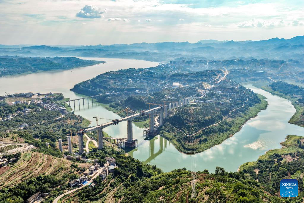 An aerial drone photo taken on Aug. 18, 2025 shows the construction site of the Quxi River double-track bridge along the Chongqing-Wanzhou high-speed railway in Chongqing, southwest China. (Xinhua/Tang Yi)