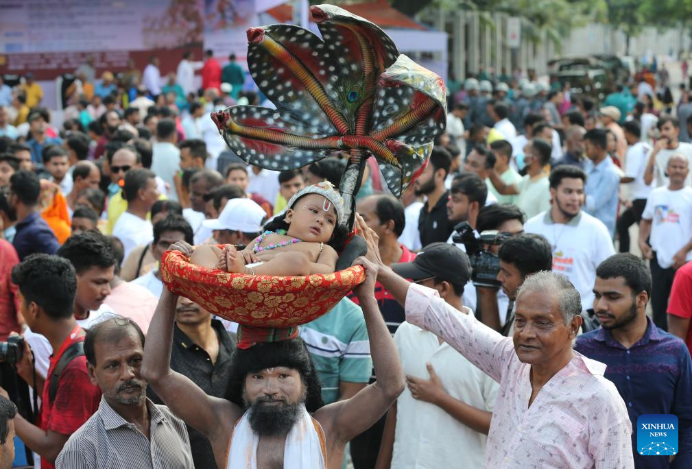 People celebrate the Krishna Janmashtami festival in Dhaka, Bangladesh, Aug. 16, 2025. The festival is celebrated annually to mark the birth anniversary of Hindu God Krishna. (Photo by Habibur Rahman/Xinhua)