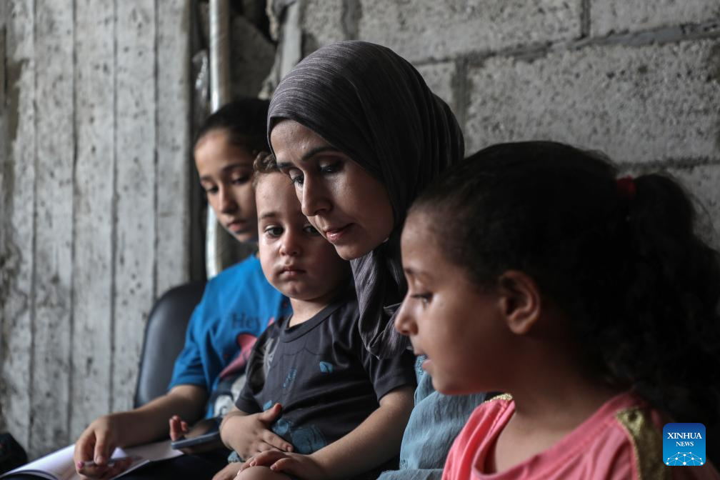 Palestinian woman Reham Said is seen with her children at a temporary shelter in Gaza City, on Aug. 13, 2025. (Photo by Rizek Abdeljawad/Xinhua)