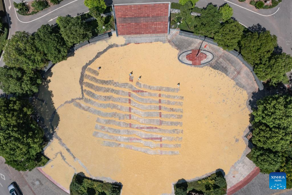 People dry grain at a government compound in Yongchuan District of southwest China's Chongqing Municipality, Aug. 20, 2025. In recent days, rice in Yongchuan District has entered the harvest season. Local government has provided public areas such as government compounds and cultural squares for farmers to dry grain. (Xinhua/Huang Wei)