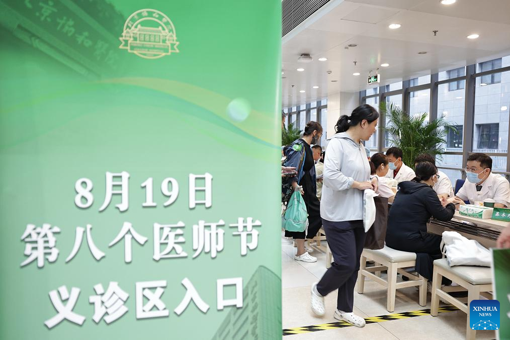 People participate in a free clinic event at Peking Union Medical College Hospital (Dongdan campus) in Beijing, capital of China, Aug. 19, 2025. Peking Union Medical College Hospital (PUMCH) held a free clinic event here on Tuesday to mark the eighth Doctors' Day. More than 50 medical staff representatives provided on-site health consultations to patients. Meanwhile, hospital volunteers drew personalized cartoon pictures for the participating medical personnel.